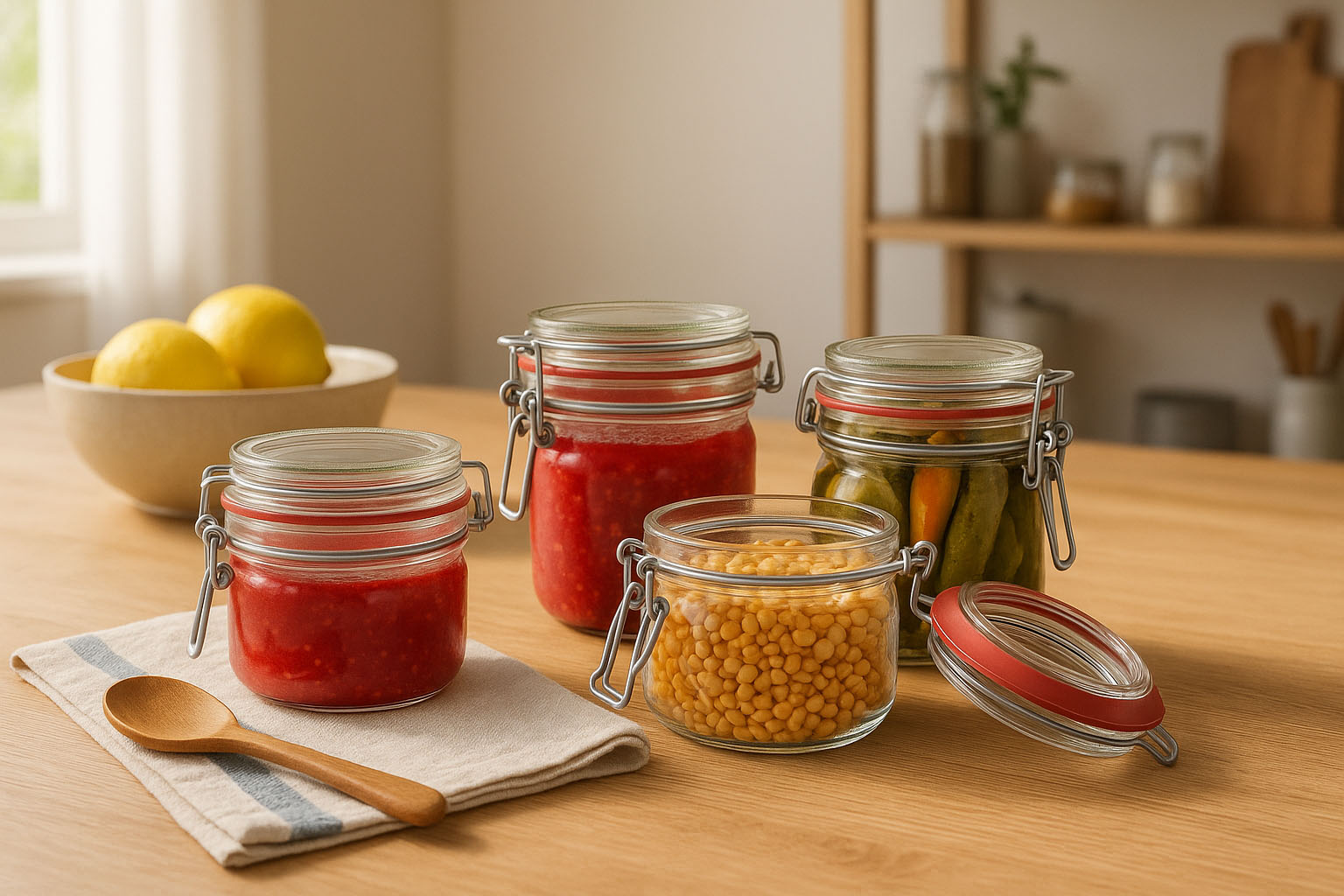 Die Drahtbügelgläser eignen sich ideal zum Einkochen und Konservieren von hausgemachten Spezialitäten wie Marmeladen, Chutneys oder eingelegtem Gemüse. Auch für die Aufbewahrung trockener Lebensmittel wie Müsli, Mehl oder Hülsenfrüchte bieten sie eine hygienische und stilvolle Lösung.