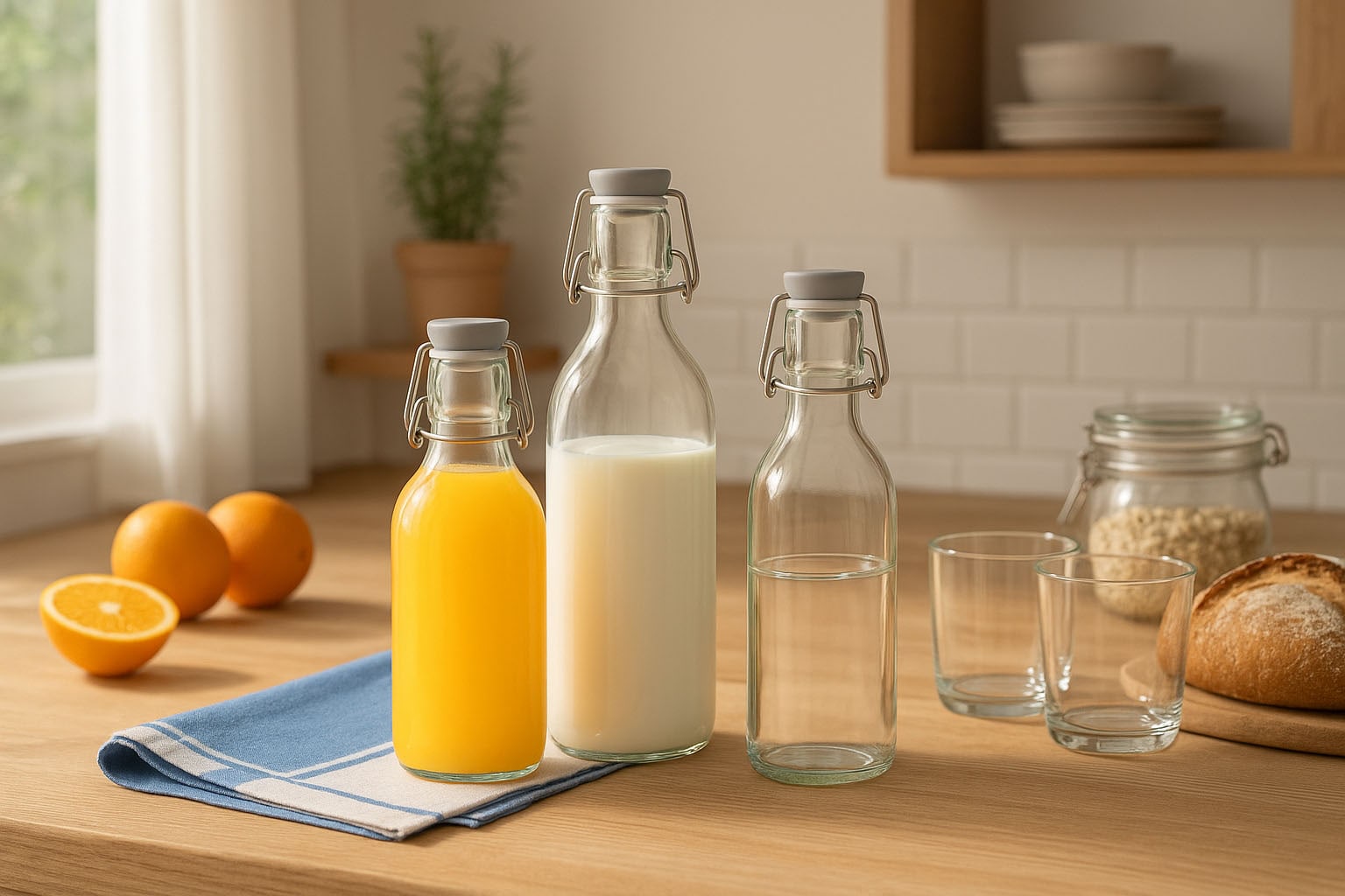 Dank ihres universellen Designs eignet sich die Serie „Emilia“ perfekt für Saft, Milch, Wein und viele weitere Füllgüter. Ob für den täglichen Gebrauch in der Küche, in der Gastronomie oder als nachhaltige Verpackung für hochwertige Produkte – sie vereint stilvolle Präsentation mit praktischer Handhabung.