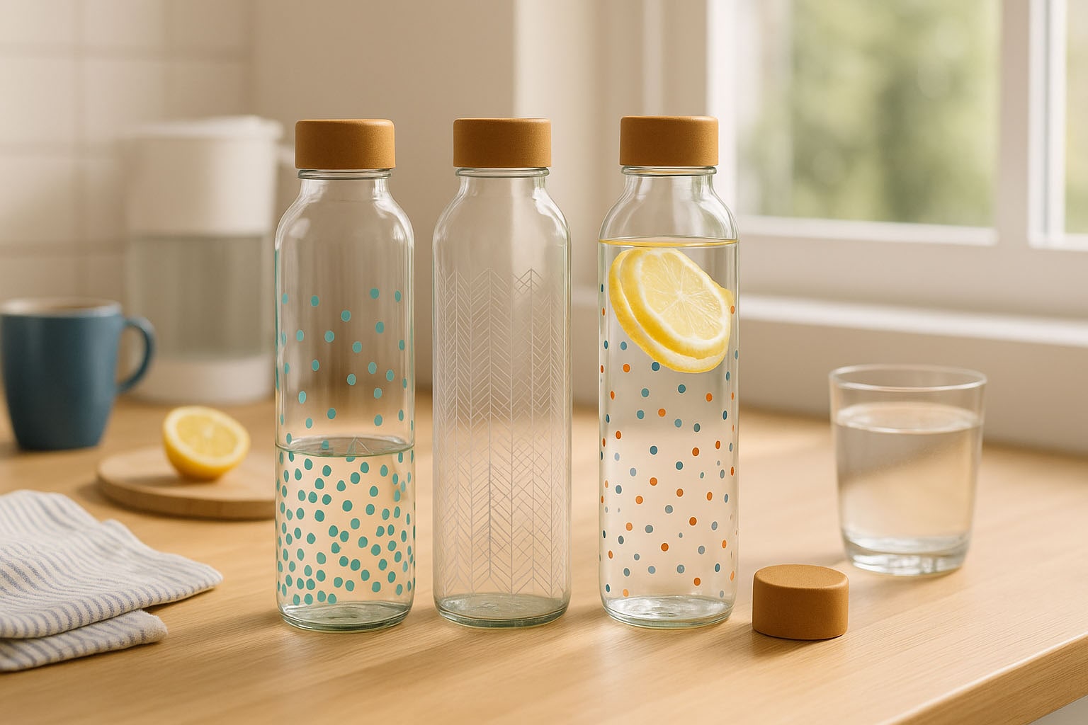 Die CARRY Bottle vereint modernes Design mit Nachhaltigkeit und Funktionalität. Sie ist die ideale Trinkflasche für umweltbewusste Menschen. Gefertigt aus hochwertigem Glas, überzeugt sie durch ihre langlebige Qualität und die schlanke, zylindrische Form, die angenehm in der Hand liegt. Die praktische Schrauböffnung sorgt für eine sichere Versiegelung – passende Deckel sind in unserem Sortiment erhältlich. Mit kreativen Motiven wie bunten Punkten, fliessenden Wasserlinien und geometrischen Strukturen setzt die CARRY Bottle stilvolle Akzente und macht das Trinken unterwegs zu einem echten Statement. Perfekt für alle, die Ästhetik und Nachhaltigkeit in ihrem Alltag vereinen möchten.