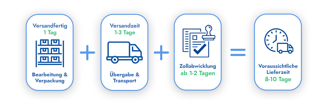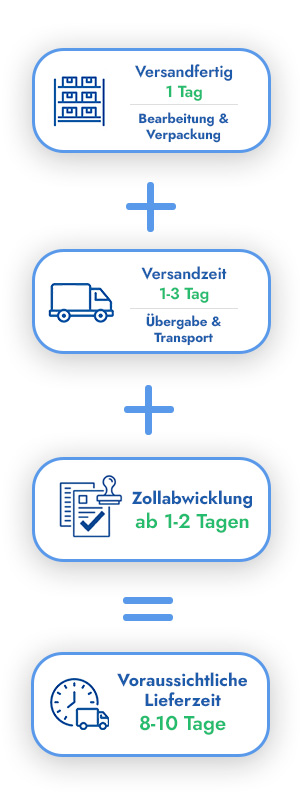 | Vereinigtes Königreich | 5 bis 10 Werktage | Paletten-Versand bei Neukunden: Bitte füllen Sie die von uns per E-Mail erhaltenen Zollpapiere vollständig aus. |
